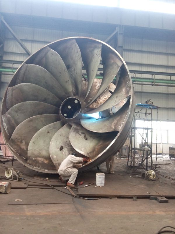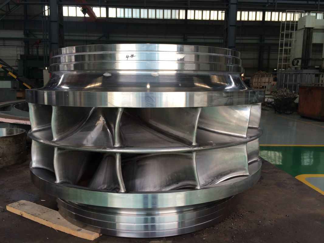 Ponte双转轮,总重量658Kg,叶片单片净重量6Kg,直径最大Φ920mm,高度615mm,由1个上冠、2个下环和26片叶片组装焊接而成,转轮材料为04Cr13Ni5Mo的马氏体不锈钢,属于新型混流高水头双转轮结构,水能发电利用率较高,转轮制作质量要求相当高。