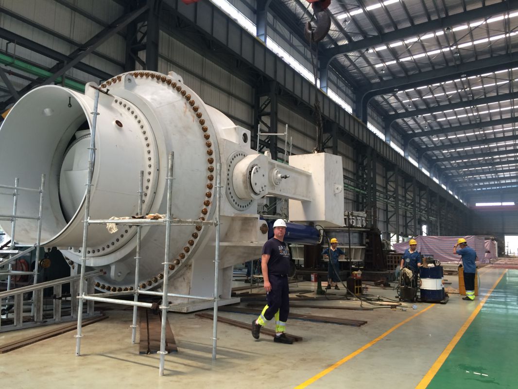 Vietas转轮,叶片单片净重量3169Kg,转轮总重量81261Kg,直径最大Φ5584mm,高度2925mm,由1个上冠、1个下环和13片叶片组装焊接而成,转轮材料为GX4CrNi13-4的马氏体不锈钢,焊缝厚度高达270mm,焊接工作量大,易变形,施焊顺序较为复杂,焊接施工难度高,是公司目前生产的结构和重量最大的焊接混流式转轮。该转轮按期焊接完工,一次验收合格,得到客户认可和高度评价。转轮已发往瑞典VIETAS KRAFTSTATION TURBIN 1 电站服役。