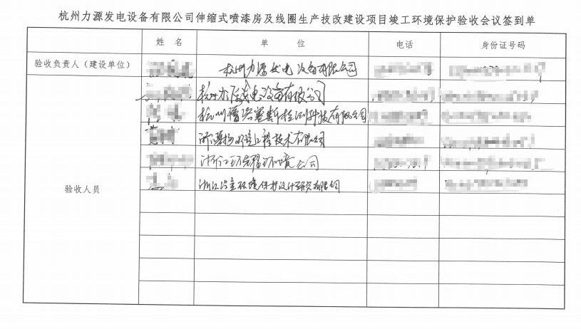 验收人员信息见附件“杭州力源发电设备有限公司伸缩式喷漆房及线圈生产技改建设项目环保设施(水和气部分)竣工环境保护验收工作组签到表”。