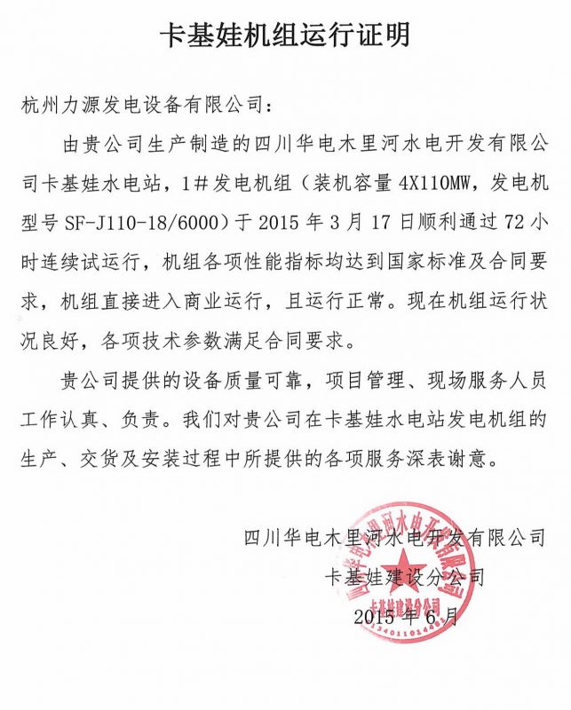 2012年2月,公司与四川华电木里河水电开发有限公司签订了四川卡基娃水电站4台套单机额定容量为110MW /122MVA的三相交流同步水轮发电机设备合同。该项目是我公司迄今为止所承接的单机容量和总装机容量最大的立式发电机,它标志着我们力源公司正式进入承接单机110MW以上机组的中大型水电设备市场。