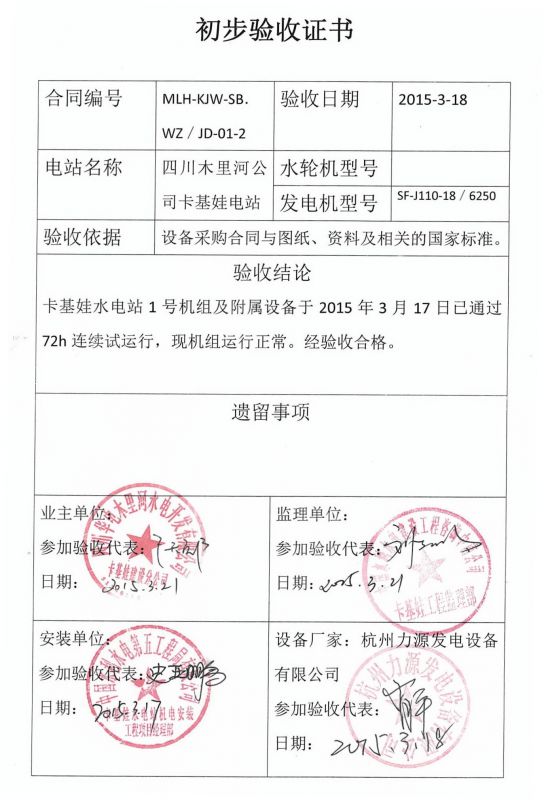 2015年12月10日下午14点,从四川卡基娃水电站工地传来佳讯,电站4#机组进入72小时试运行考核。至此,加至先前1~3#机的顺利进入商业运行,卡基娃4台发电机组已全部安装完毕。
