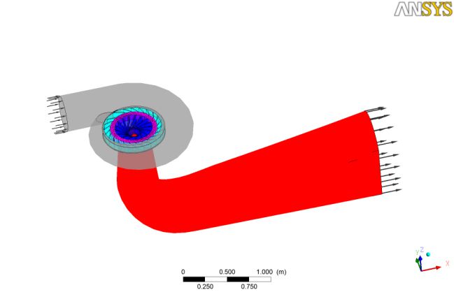 公司引进的流场仿真软件—ANSYS CFX。ANSYS CFX是全球第一个在复杂几何、网格、求解这三个CFD传统瓶颈问题上均获得重大突破的商业CFD软件。借助于其独一无二的,有别于其他CFD软件的技术特点,ANSYS CFX 领导着新一代高性能CFD商业软件的整体发展趋势。 在与清华共同合作过程中,研发人员熟练掌握ANSYS CFX软件在水轮机流场计算中的应用,水轮机的流道优化分析,针对各部件的水力损失进行优化,使其损失降为最低,让整个机组效率达到最高,以及预测水轮机内部的水力稳定性和全流道压力脉动特性。2015年已经成功完成了Y100,Y152,Y300新转轮的研发。其中Y100转轮流道开发是针对400米水头段老电站的改造,对流道及能量指标有特定的要求,通过与清华大学热能工程系研发人员的多次沟通交流,反复的计算分析和优化,使其达到了开发任务书的要求,把整体流道的水力损失降到最低,计算的水轮机装置效率达到94.77%。