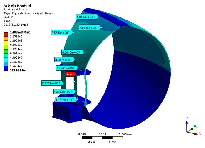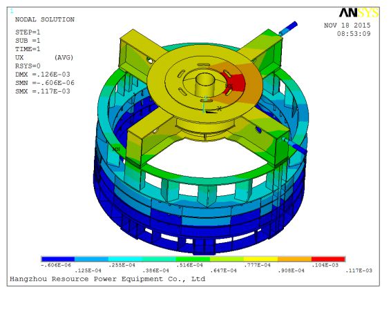为了提高产品质量,在水机部、电机部的产品设计及生产过程中,研发部采用ANSYSY Mechanical结构力学分析软件对产品进行有限元分析,优化产品结构以降低生产成本,并确保机组能够安全稳定运行。如水轮机蜗壳、座环、底环、顶盖、导叶、控制环、主轴、转轮以及尾水管的结构优化设计,电机上机架、下机架、转子支架以及机座等的结构优化设计,机组轴系临界转速和通风计算等;