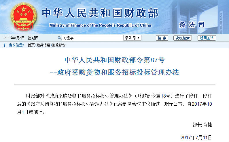 财政部:“最低价中标”再见!2017年10月1日起施行!